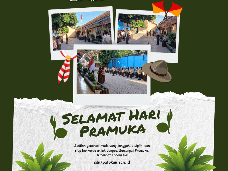 SDN 7 Patokan menggelar upacara bendera dan serangkaian kegiatan untuk memperingati Hari Pramuka yang jatuh setiap tanggal 14 Agustus. Peringatan ini diadakan untuk menanamkan nilai-nilai luhur kepramukaan seperti disiplin, kemandirian, dan semangat gotong royong kepada para siswa. Acara ini diikuti oleh seluruh siswa dan guru SDN 7 Patokan, dengan Kepala Sekolah bertindak sebagai pembina upacara dan memberikan sambutan. Kegiatan peringatan Hari Pramuka berlangsung khidmat dan meriah di lapangan SD Negeri 7 Patokan