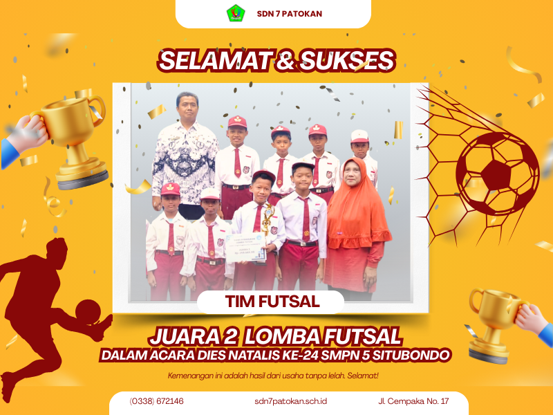 SDN 7 Patokan berhasil meraih Juara 2 dalam Kejuaraan Futsal yang digelar dalam rangka Dies Natalies SMPN 5 Situbondo, menunjukkan semangat dan keterampilan tim futsal sekolah dalam berkompetisi di tingkat kecamatan. Dengan kerja sama tim yang solid dan strategi yang matang, para siswa SDN 7 Patokan mampu menunjukkan penampilan yang impresif dan bersaing dengan sekolah-sekolah lain. Keberhasilan ini menjadi bukti bahwa SDN 7 Patokan memiliki potensi besar dalam bidang olahraga, khususnya futsal, dan diharapkan dapat terus meningkatkan prestasi di masa depan.